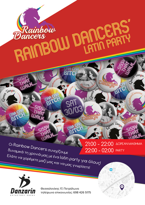 Από τις 21:00 μέχρι τις 22:00 θα πραγματοποιηθεί δωρεάν μάθημα από τον δάσκαλο των Rainbow Dancers Δημήτρη Κοκκώνη σε πόζες χορευτική έκφραση αλλά και catwalk. Στην συνέχεια θα ακολουθήσει το πάρτι μας από τις 22:00 μέχρι τις 02:00. Θα ξεφαντώσουμε με ρυθμούς Salsa, Bachata, Merengue, Reggaeton, Mambo, Cha-cha-cha, Rumba, Rock & Roll και Tango.